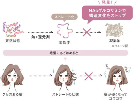 従来のストレートパーマをした毛髪は、表面付近に塗料が多くなり、色沈みの原因に。髪のタンパク質が凝集体に変わるのを抑えることで、従来のストレートパーマに比べてカラーの色沈みを軽減。明るいカラーが楽しめるようになりました。